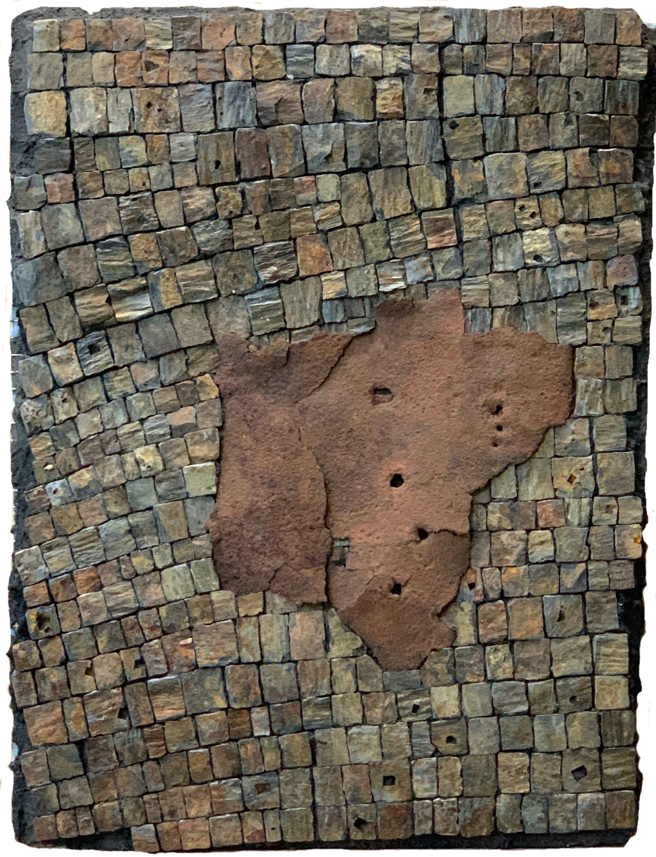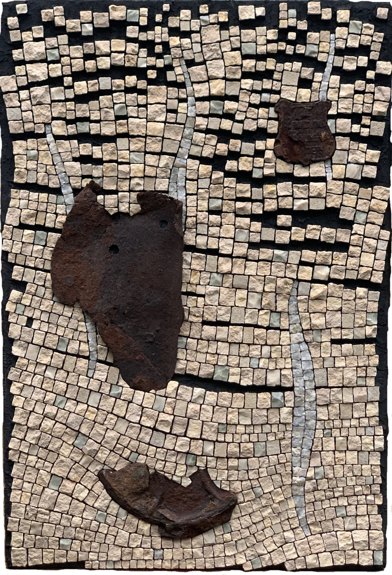 2026; 13” x 23.5” rust, travertine, marble, glass, porcelain, moon snail operculum